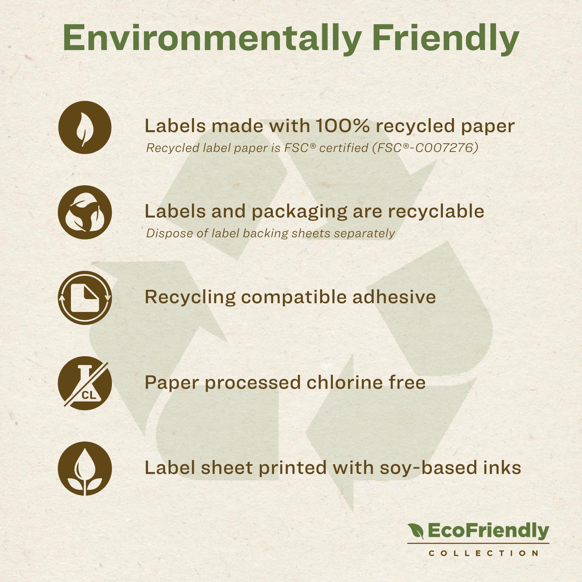- With paper processed chlorine-free, these recycled labels are created in a way that substantially reduces the number of harmful substances used during manufacturing