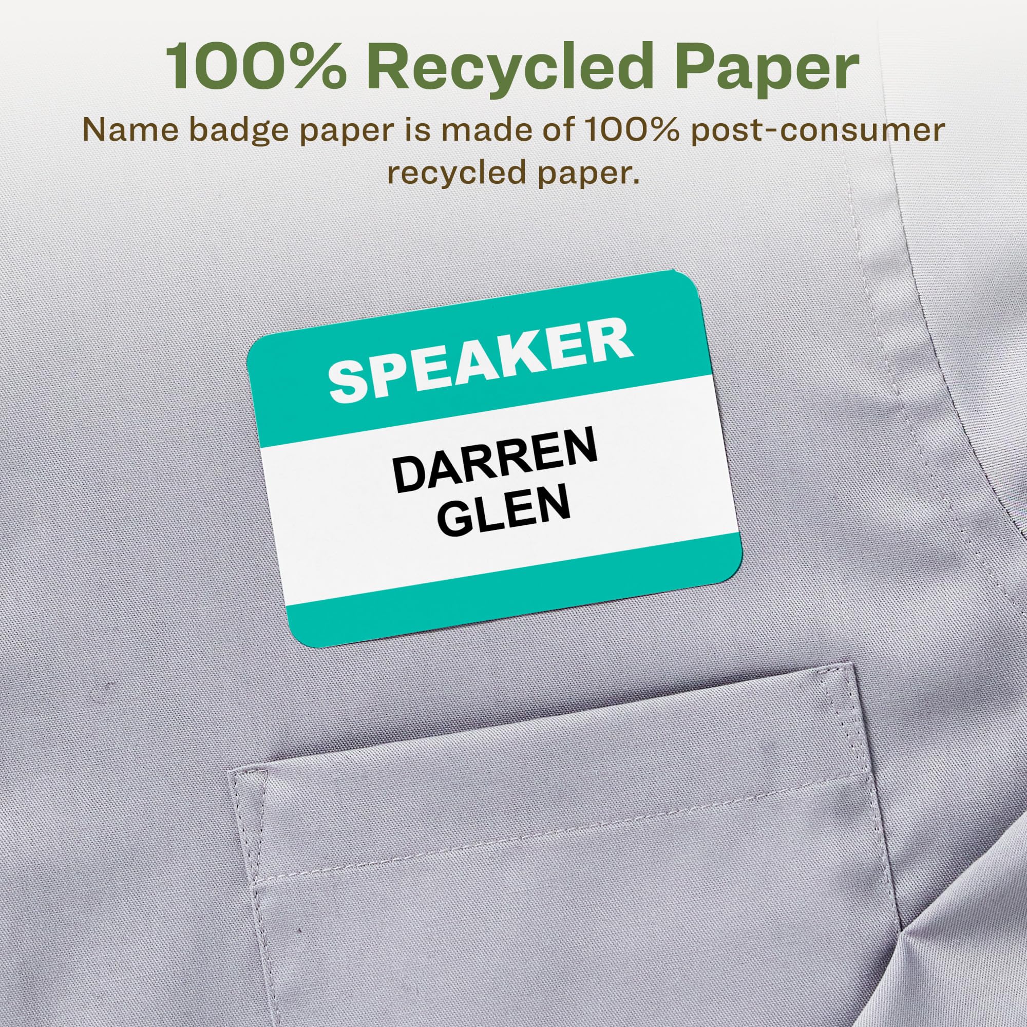- These recycled name badges are created with 100% post-consumer recycled paper; name badge paper is also sourced responsibly to ensure the responsible use of the world's forest resources