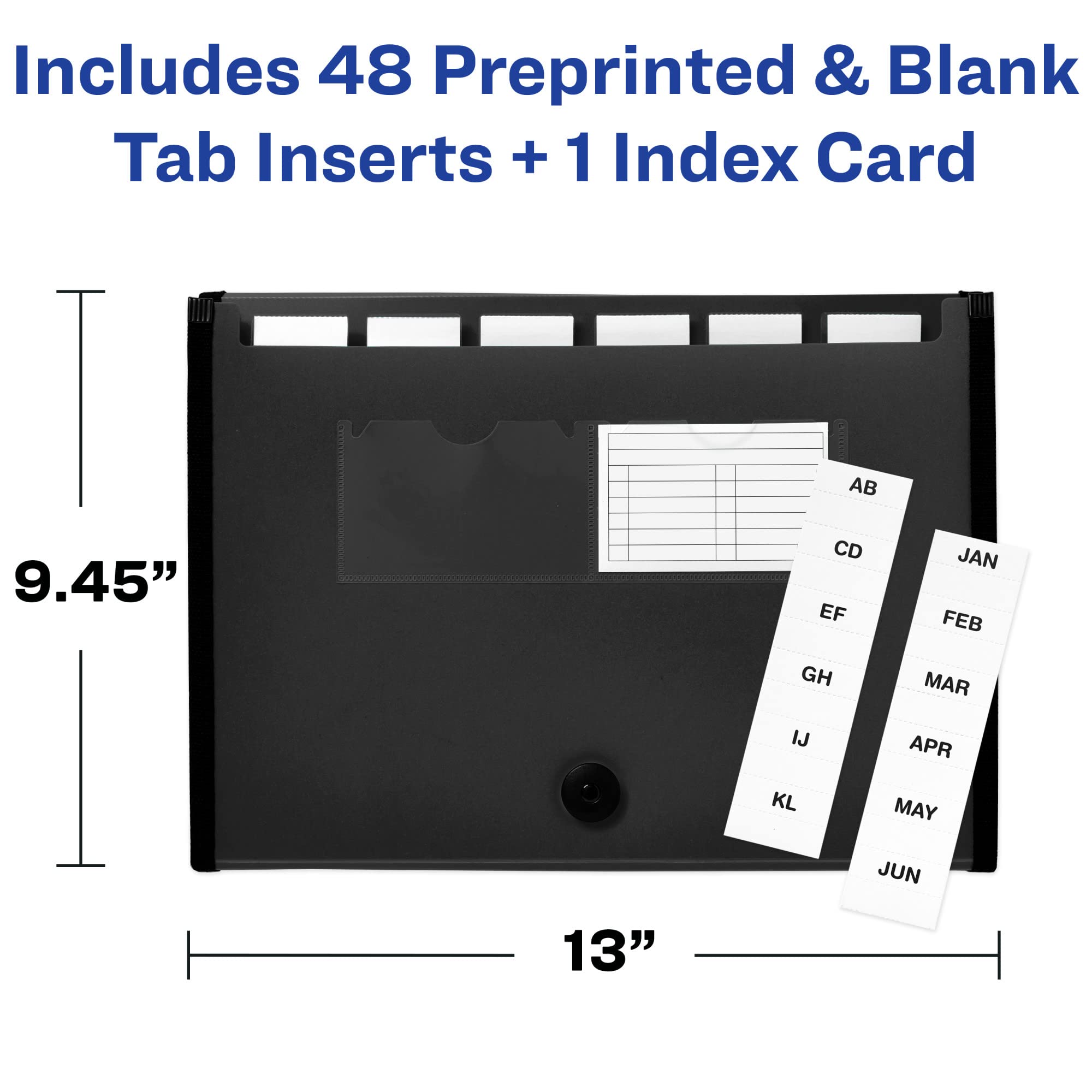 - Includes 1 index card, a set of preprinted A-Z and monthly tab inserts as well as a set of blank handwritable inserts