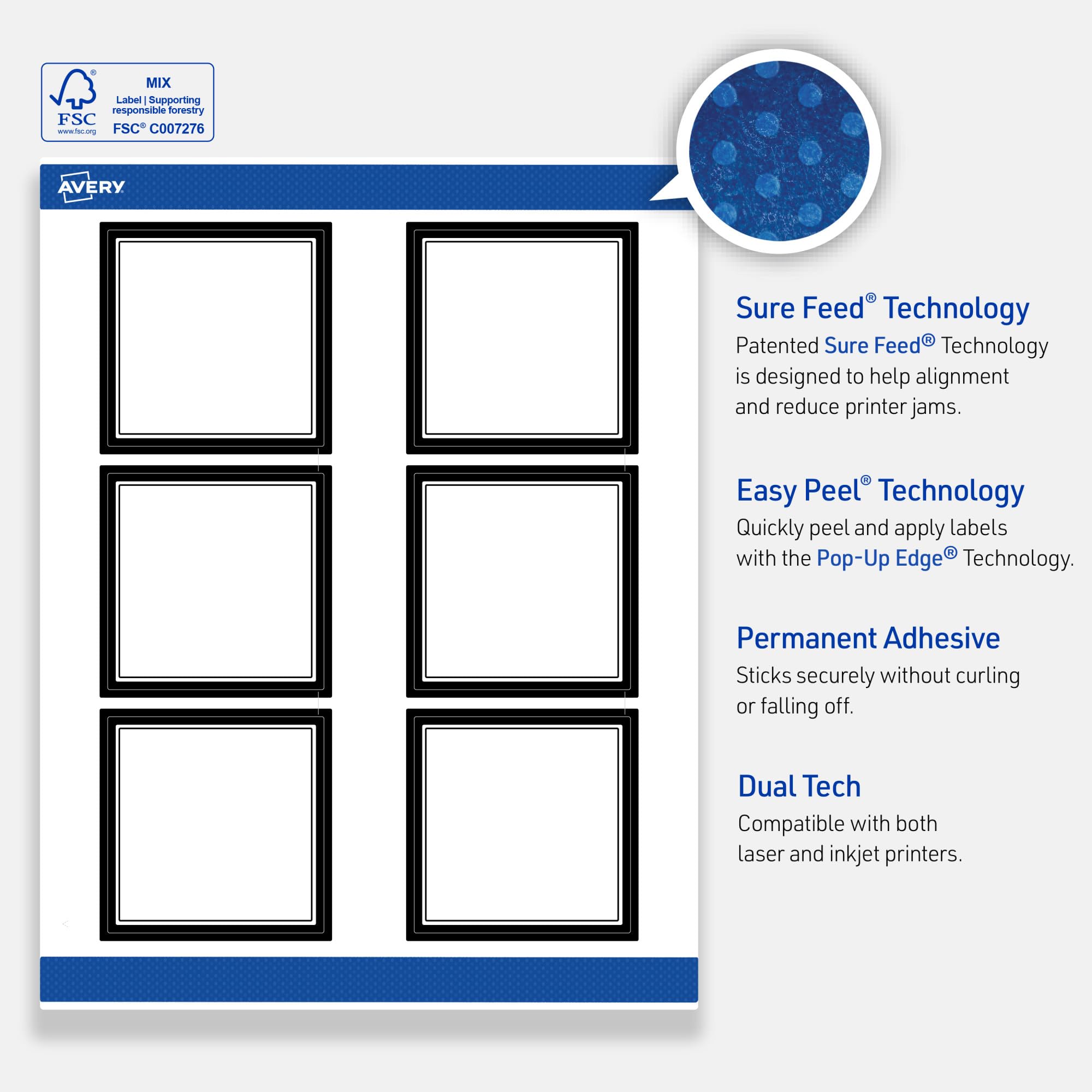 - Avery labels with patented Sure Feed technology provide a more reliable feed through your printer, reducing misalignments and jams